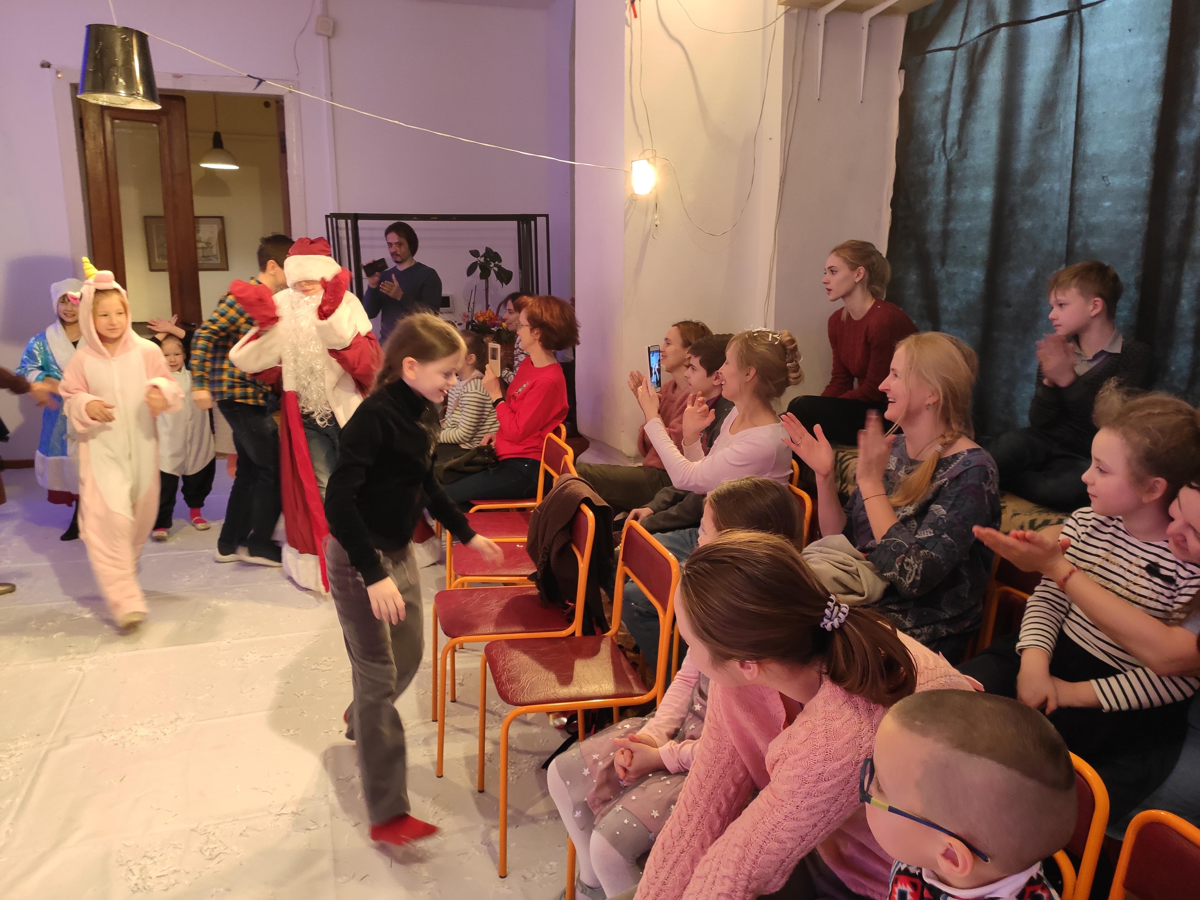 После спектакля, зрители покажут несведущим муми-троллям, которые наконец-то узнали, что Рождество — это совершенно не страшно и не опасно, ЧТО такое Новый год и КАК мы его празднуем. Зрители (дети и их родители) делятся на две команды и, выполняя различные задания, приближаются к празднованию Нового года.