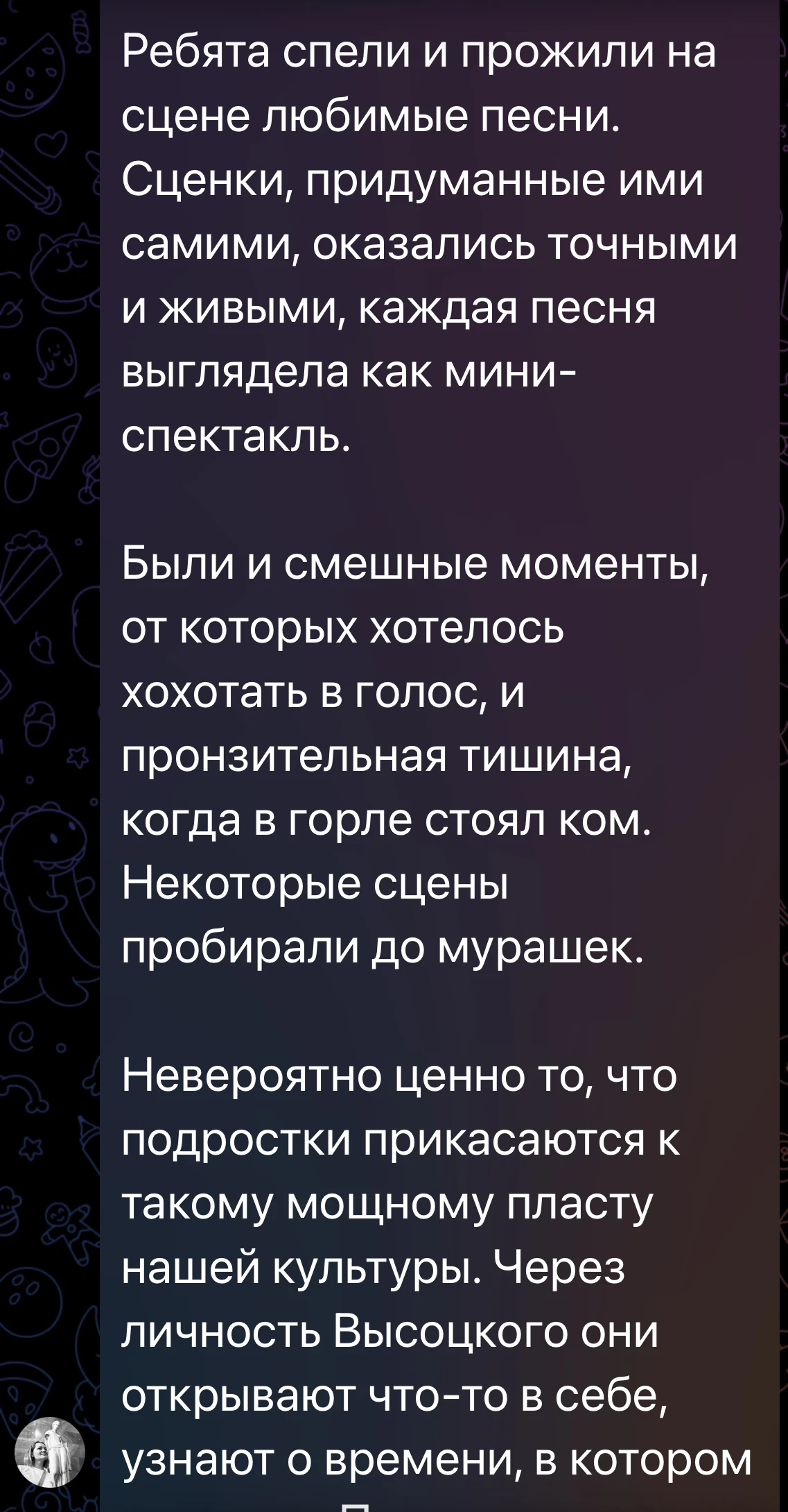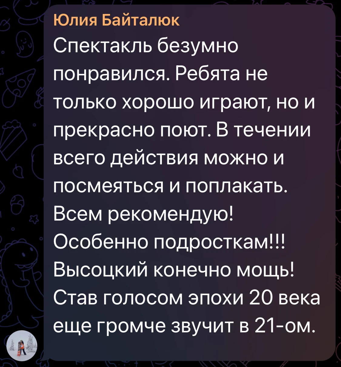 Спектакль — сценическое исследование феномена личности и творческого наследия Владимира Высоцкого глазами современного подростка.