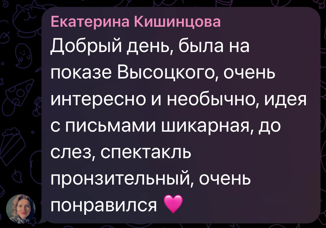 В спектакле звучат стихи и песни Высоцкого, фрагменты писем и воспоминаний современников, в том числе свидетельства о дне его ухода. Документальные тексты становятся частью живого сценического действия и вводят в художественную ткань исторический контекст эпохи.